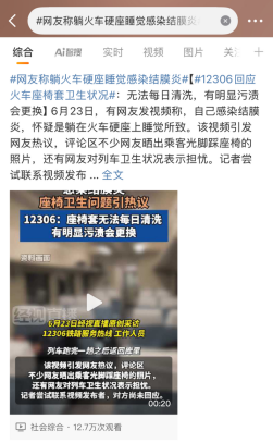 近日,一则视频在社交平台引发热议。网友称自己在火车硬座上躺睡后,眼睛出现红肿、刺痛和分泌物增多等症状,被确诊为结膜炎。她怀疑感染源正是列车座椅。