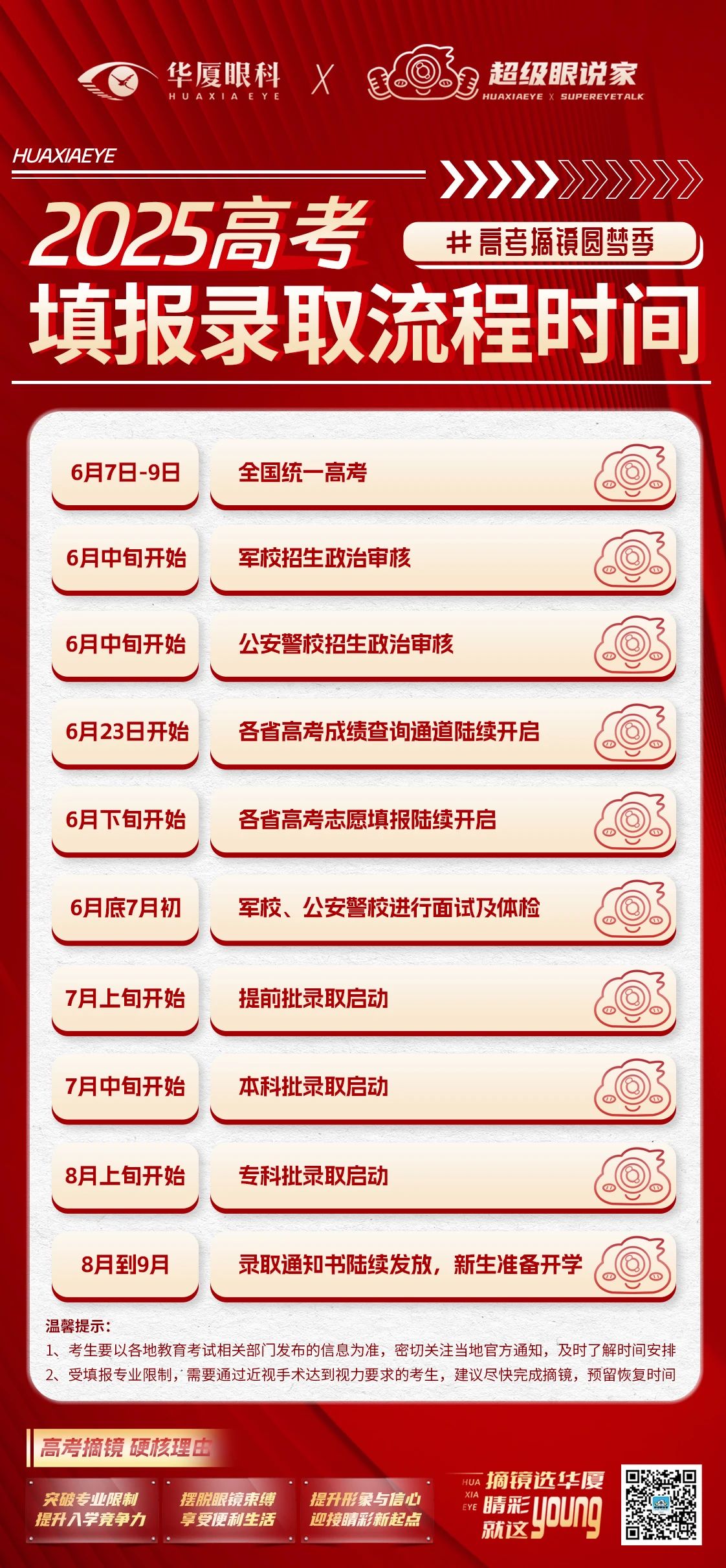 2025年高考已落幕,成绩公布的钟声即将敲响,紧接着便是志愿填报的关键时期,清晰的视力将为你打开更宽广的未来。此刻选择近视手术,不仅是告别近视困扰,更是为专业选择和睛彩未来赢取关键竞争力!
