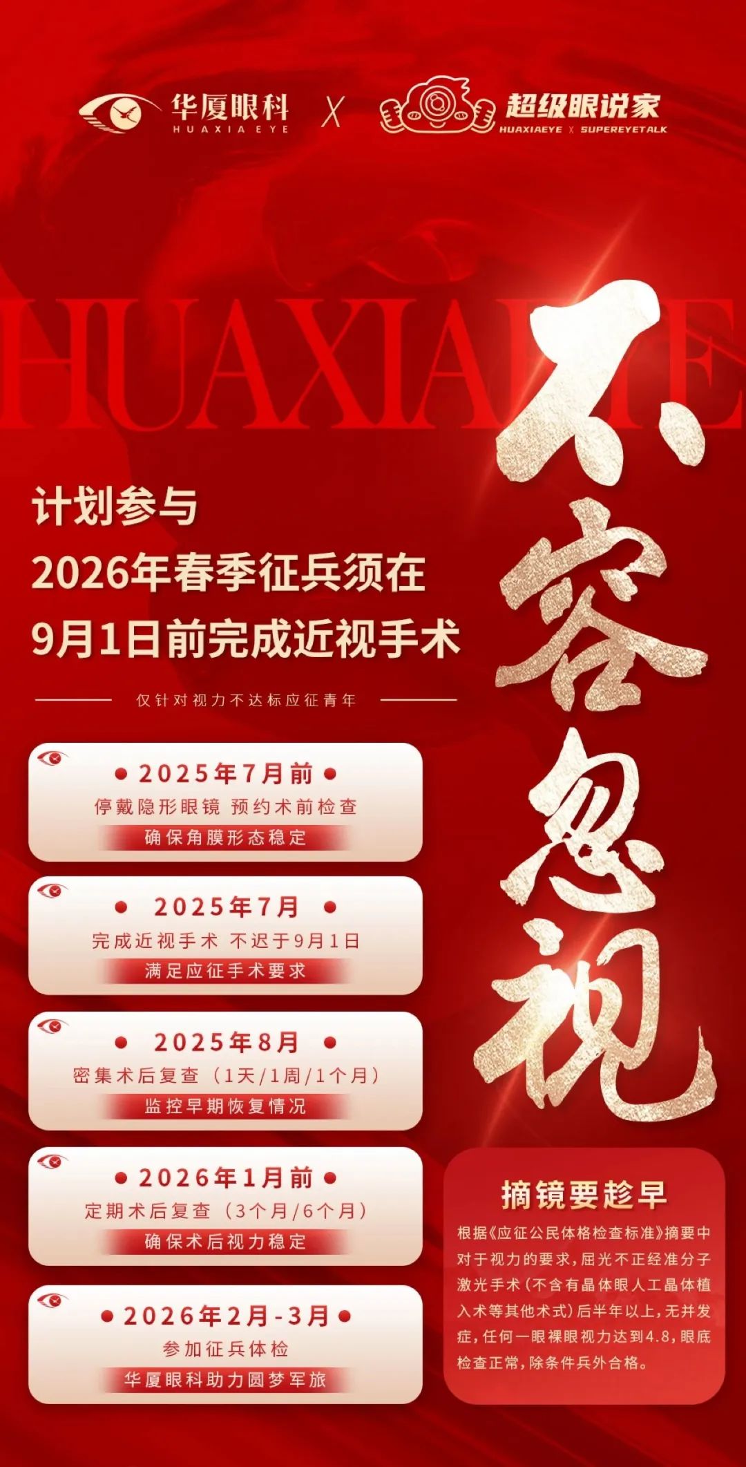 这意味着,如果你计划投身2026年春季的征兵行列,而视力尚未达标,现在就必须立即行动!根据要求,近视矫正手术必须在2025年9月1日前完成并确保视力稳定达标。这不是建议,而是关乎你能否顺利迈入体检环节的关键硬性条件。