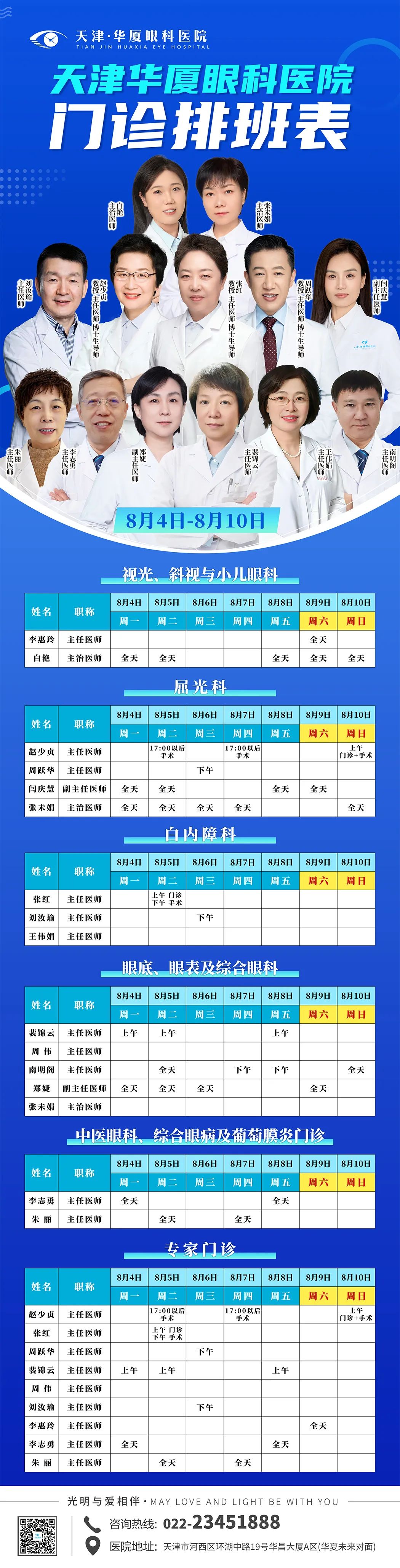 🗓️8月4日-8月10日天津华厦眼科医院各专科出诊安排如下;